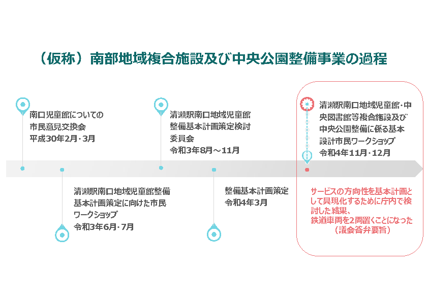 一つ目の資料が、南部地域複合施設及び中央公園整備事業の過程において、鉄道車両の構想がどの段階で出てきたものなのか、まとめたものになります。先ほどちょっと香川議員の質疑の中でも、流れで出てきたんですが、まず最初、平成30年に行われた南口児童館についての市民意見交換会がありました。その後、令和3年6月、7月に行われた清瀬駅南口地域児童館整備基本計画策定に向けた市民ワークショップがございます。その後、令和3年8月から11月の清瀬駅南口地域児童館整備基本計画策定検討委員会がありまして、今度令和4年3月に整備基本計画が策定されました。整備事業については、こうした経緯をたどってきておりますが、ここまでは鉄道車両を置くという話は出てきておりません。出てきたのは、こちらの令和4年11月、12月に行われた、清瀬駅南口地域児童館・中央図書館等複合施設及び中央公園整備に係る基本設計市民ワークショップの際でございます。