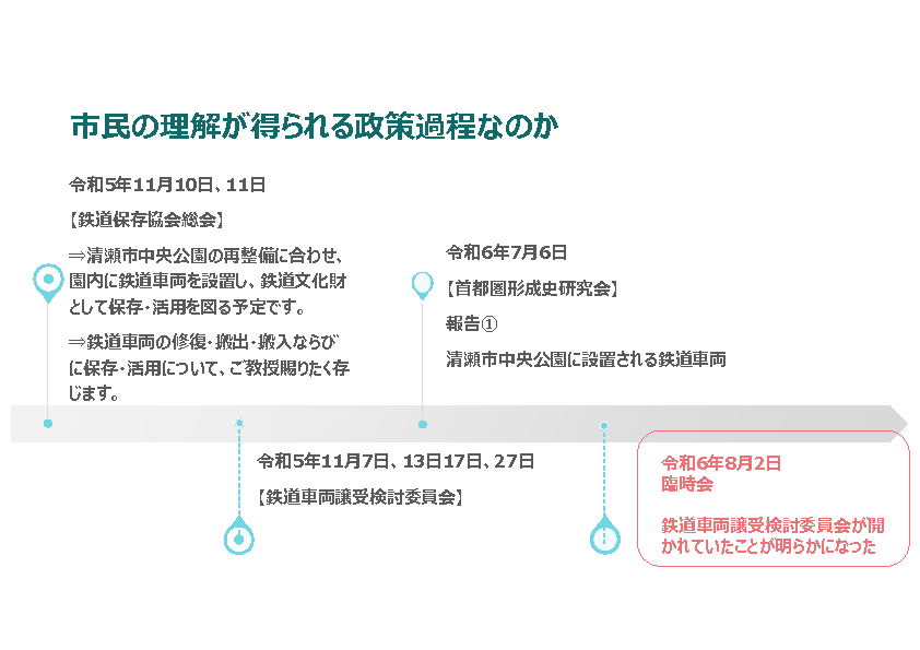 こちらは、市民の理解が得られる政策過程なのかと題して、今回、鉄道車両譲受検討委員会というものが、令和5年の11月7日、13日、17日、27日とありました。譲受検討委員会開かれてから8か月近く、市議会のほうには特に、そういった検討委員会開かれましたという報告は特になかったんですね。知ったのが、この臨時会の後だったか、前だったか。そこで本当にそういった委員会があるんだなというのは知ったぐらいでした。鉄道車両については鉄道車両譲受検討委員会からの提言もあって譲り受けることに決定したと。前に夢空間復活プロジェクトのフェーズにもあったんですが、この鉄道車両譲受検討委員会の前に、よく調べてみると、この清瀬市は鉄道保存協会の総会というものに、令和5年11月10日と11日に出席をされております。その際、清瀬市は鉄道保存協会の総会のほうに資料を出していて、その中で清瀬市は、清瀬市中央公園の再整備に合わせ、園内に鉄道車両を設置し、鉄道文化財として保存・活用を図る予定です。そして、鉄道車両の修復・搬出・搬入ならびに保存・活用について、ご教授賜りたく存じますという資料を出していたわけですが、これは夢空間という名前を出して保存・活用について意見を求めていたのか、こちらご見解を伺いたいと思います。