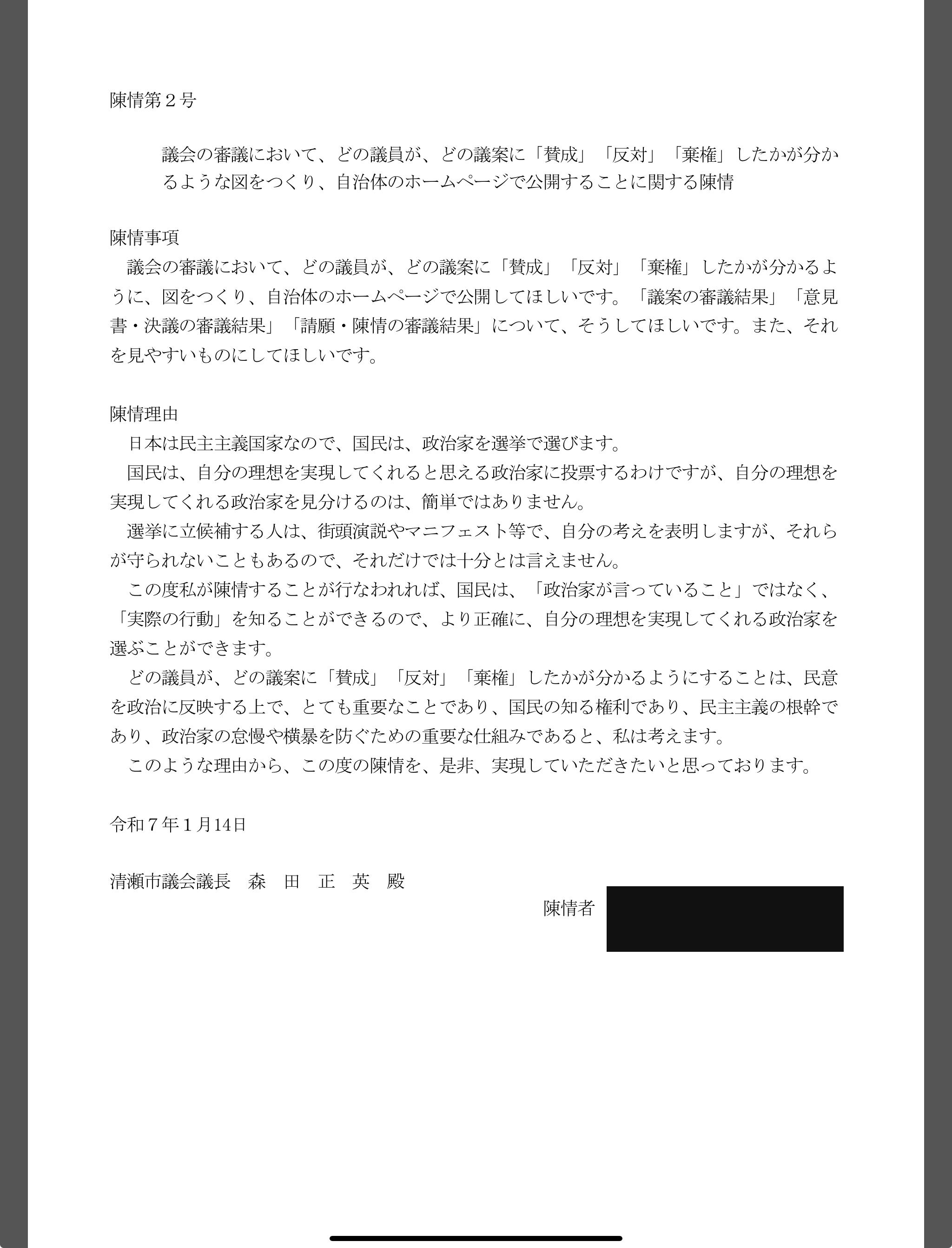 なお、同一提出者による「陳情第1号」においては、内容によっては偏見や差別を助長しかねない懸念があると考えております。清瀬市議会としても全会一致で不採択となりました。